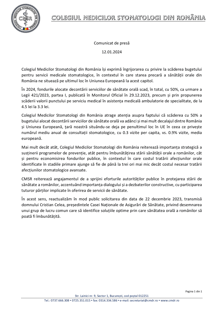 Comunicat de presa al CMSR / 12 ianuarie 2024, cu privire la scăderea bugetului pentru servicii medicale stomatologice de către CNAS